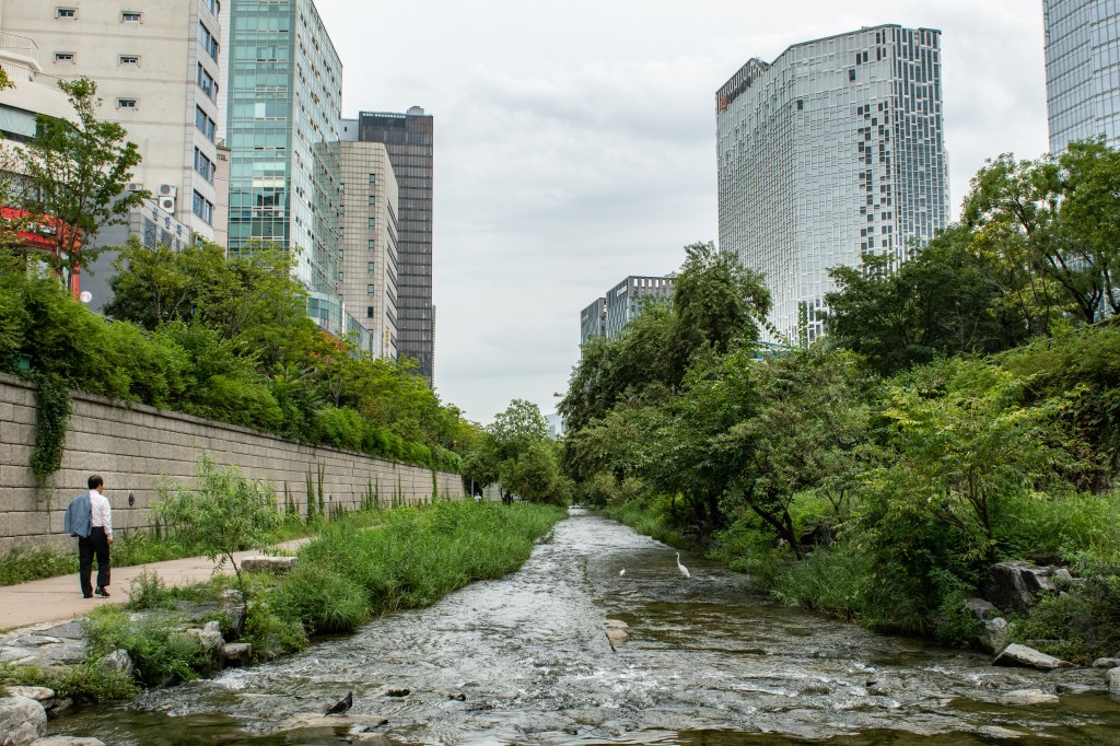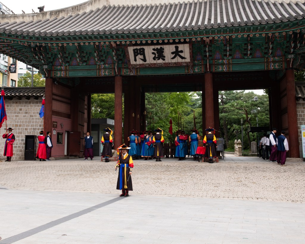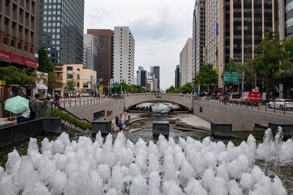 Our first day in Seoul was Mike’s birthday! Mike got to pick what we did and he picked so many fun things! We started the day by walking down the Cheonggyecheon Stream which was right next to our hotel. It was so peaceful to walk down the banks of the stream. It was also kind of surreal walking beside this stream in the middle of a metropolis! We walked to the plaza, which is one of the ends of the stream, and got there right before they shut the fountain off. From the stream, we started walking towards Namdaemun Market. On the way there, we happened to walk by the front gate of the Deoksugung Palace while there was a changing of the guards ceremony taking place. We watched the guard change and then Mike got a picture with the commander!