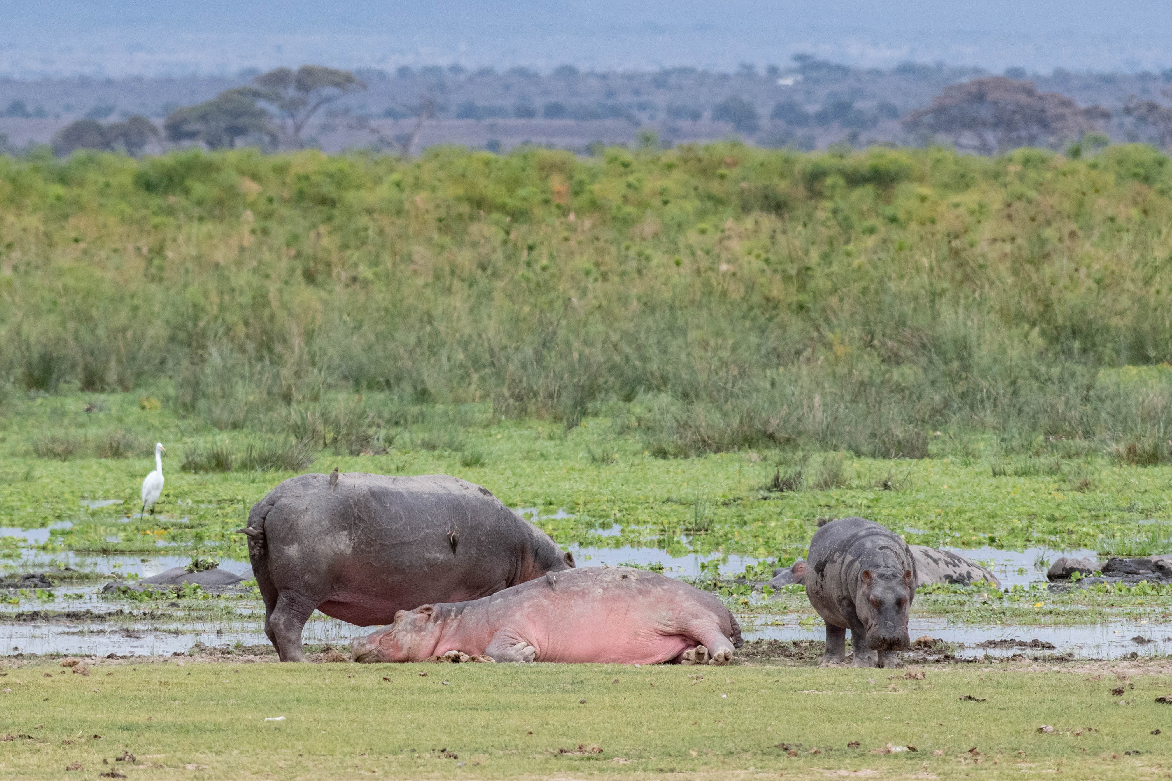 We flew out of Nairobi on a chartered flight to Amboseli and had a mini game drive on the way to our hotel. We ate lunch and then had an afternoon game drive with a beautiful sunset! The next day, we settled into our usual safari routine of a morning game drive, break, and an afternoon game drive. Our first day and a half in Amboseli really delivered! We saw cute elephants, hoofstock, flamingos, birds, and hippos! So many hippos! We watched a bloat just floating around in one of the areas and realized that there were elephants in the swamp behind them! The elephants were up to their necks in the water, just grazing. It was so crazy to think how deep that swampy area was when you think there was a whole elephant underneath!