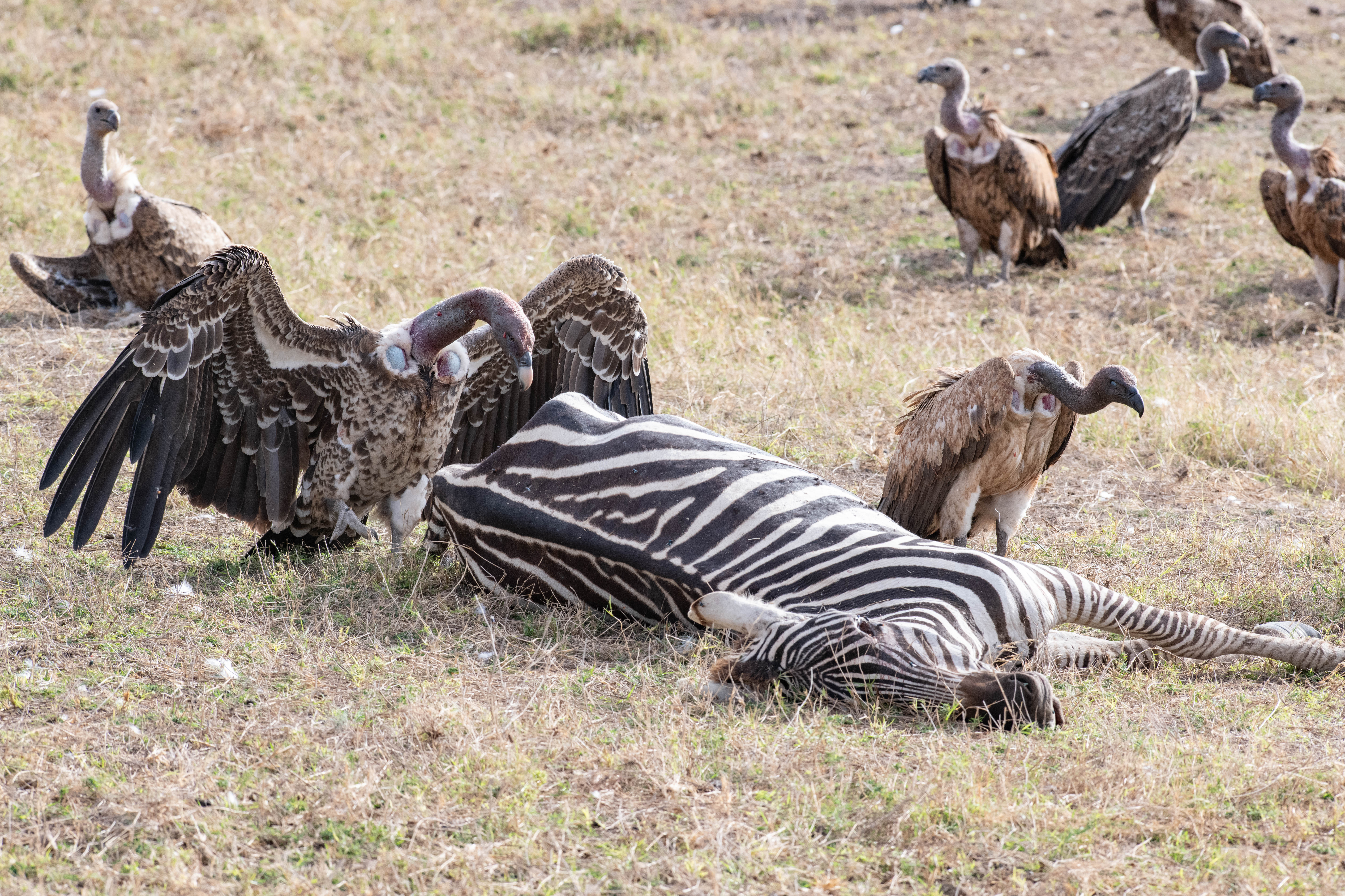 One of the more interesting things we saw was a recently deceased zebra that was providing sustenance for a load of vultures. We watched them for a while, and our driver, Xavier, explained that there’s a hierarchy of vultures. The largest ones get the first feed, and they will run off the smaller ones to get their fill. After the largest ones are done, the medium ones come in and get their fill. When we rolled up on the scene, the large ones were in the process of running off the smaller ones. It was kind of funny to watch them because a smaller one would come up from behind and the large one would turn around and run it off and while it was running that one off, two others would sneak in for a bite! It was very entertaining to watch them! The less glamorous part was how they were eating the zebra – they would go in through the rectum of the zebra and feed on the innards. We also learned that this is why vultures have naked necks – it’s to prevent them getting soaked in blood. Nature is wild!