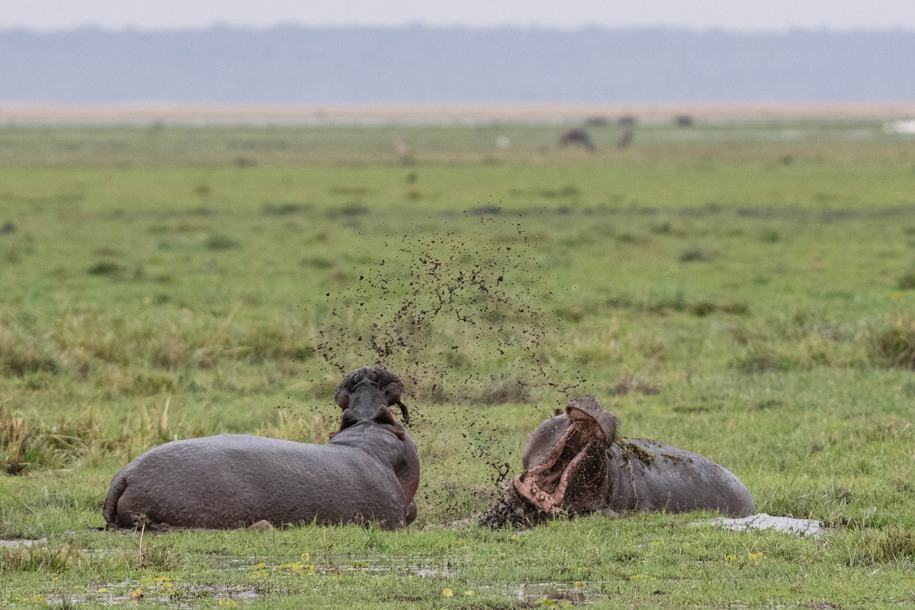 We watched the little lion family for a bit and then moved on. I got some amazing pictures of them! Amboseli also has some insane amounts of flamingos and I really enjoyed getting some great pictures of them! One of the highlights of our time in Amboseli was a hippo fight that just kept going on and on – thrashing heads, circling, wide mouths jousting, and water flying everywhere! When we rolled up to the scene, it appeared that there were two males fighting over one female. The interesting thing was that the males would joust for a bit and then circle and come back to joust. Typically, hippo fights don’t last that long – it’s a one or two round thing and one just slinks off. But these two just kept going at it and it made for some truly incredible pictures! The funniest part was that after the first couple of rounds, the female just meandered away from the chaos and went off to eat some grass. So these two males were just fighting over nothing!