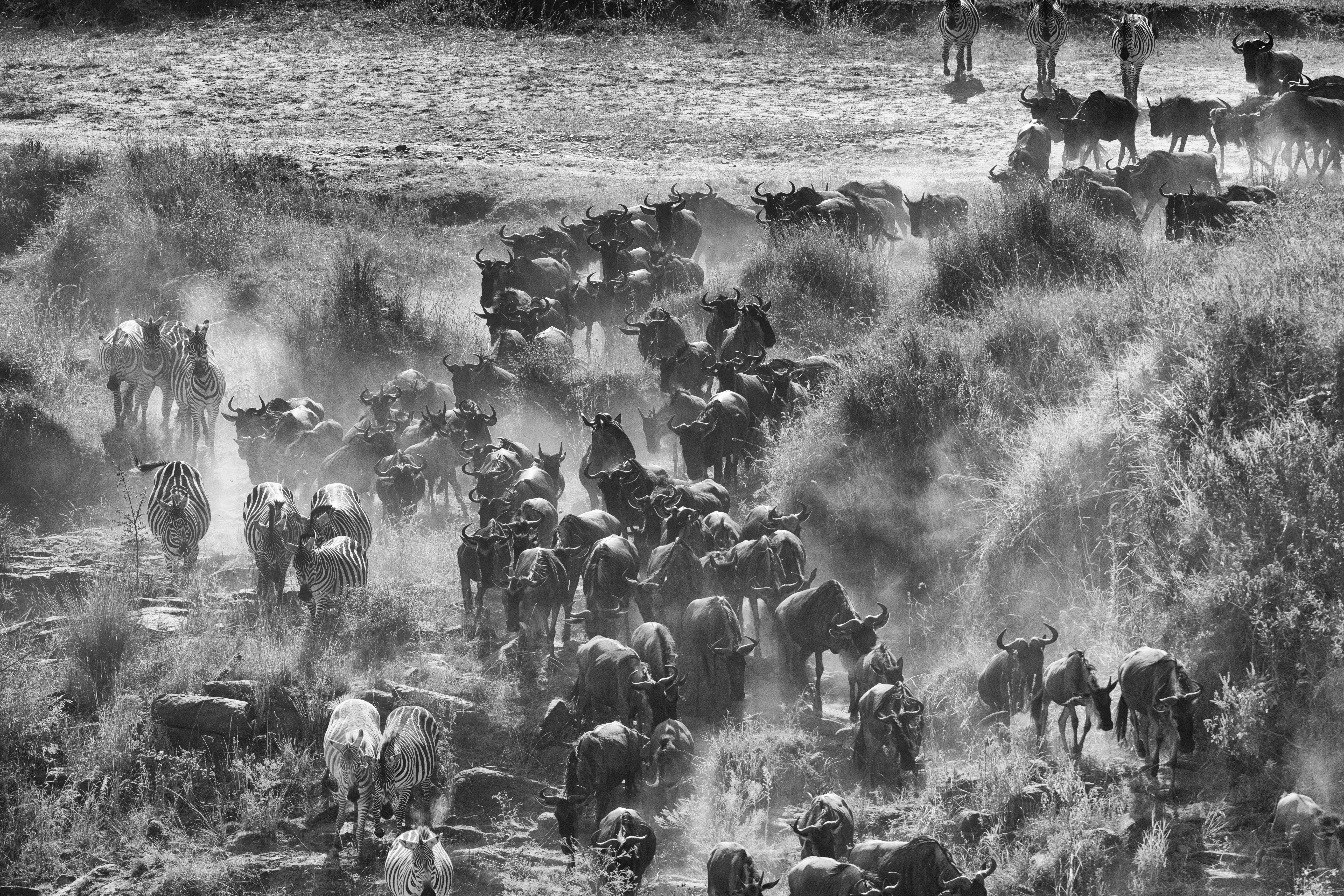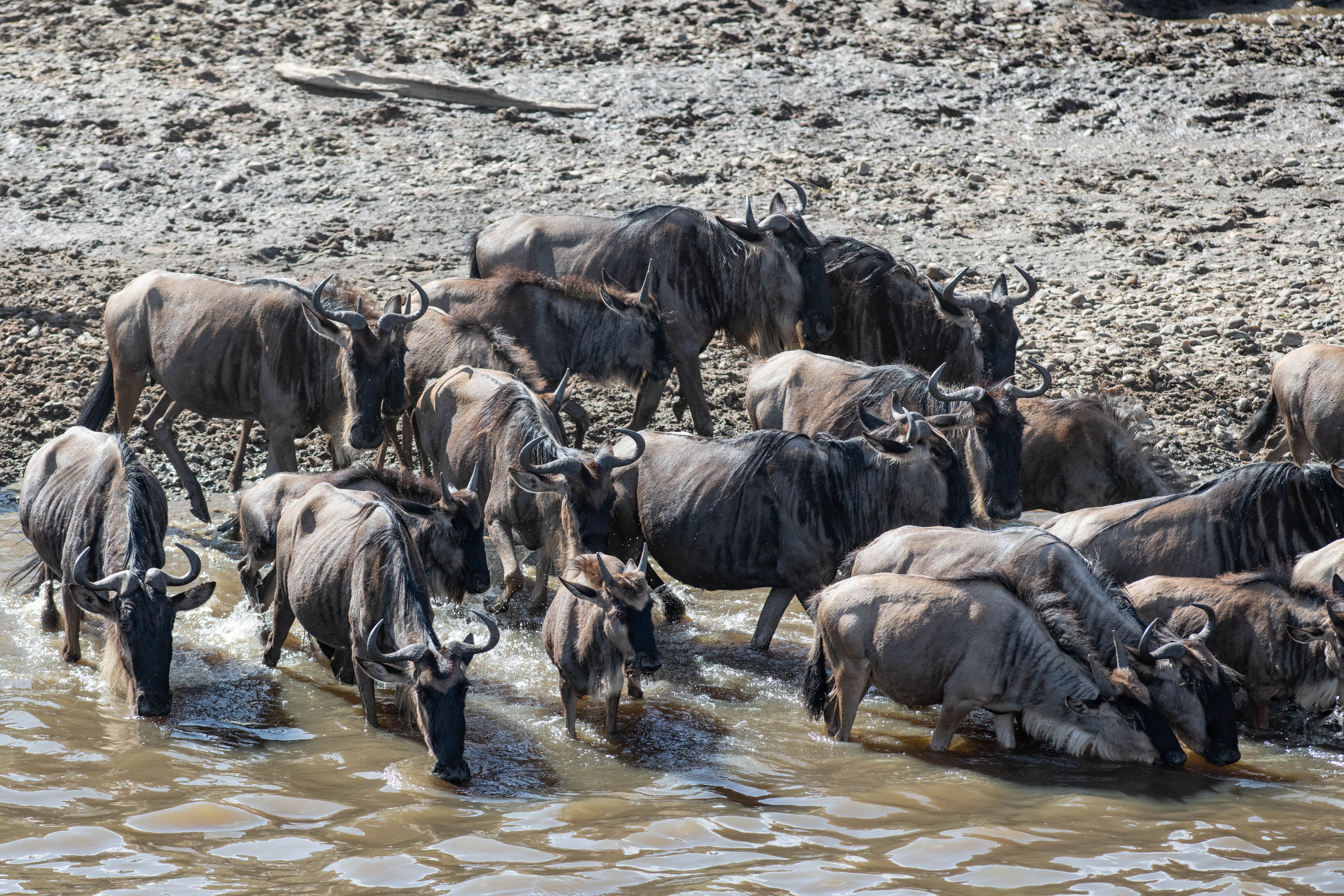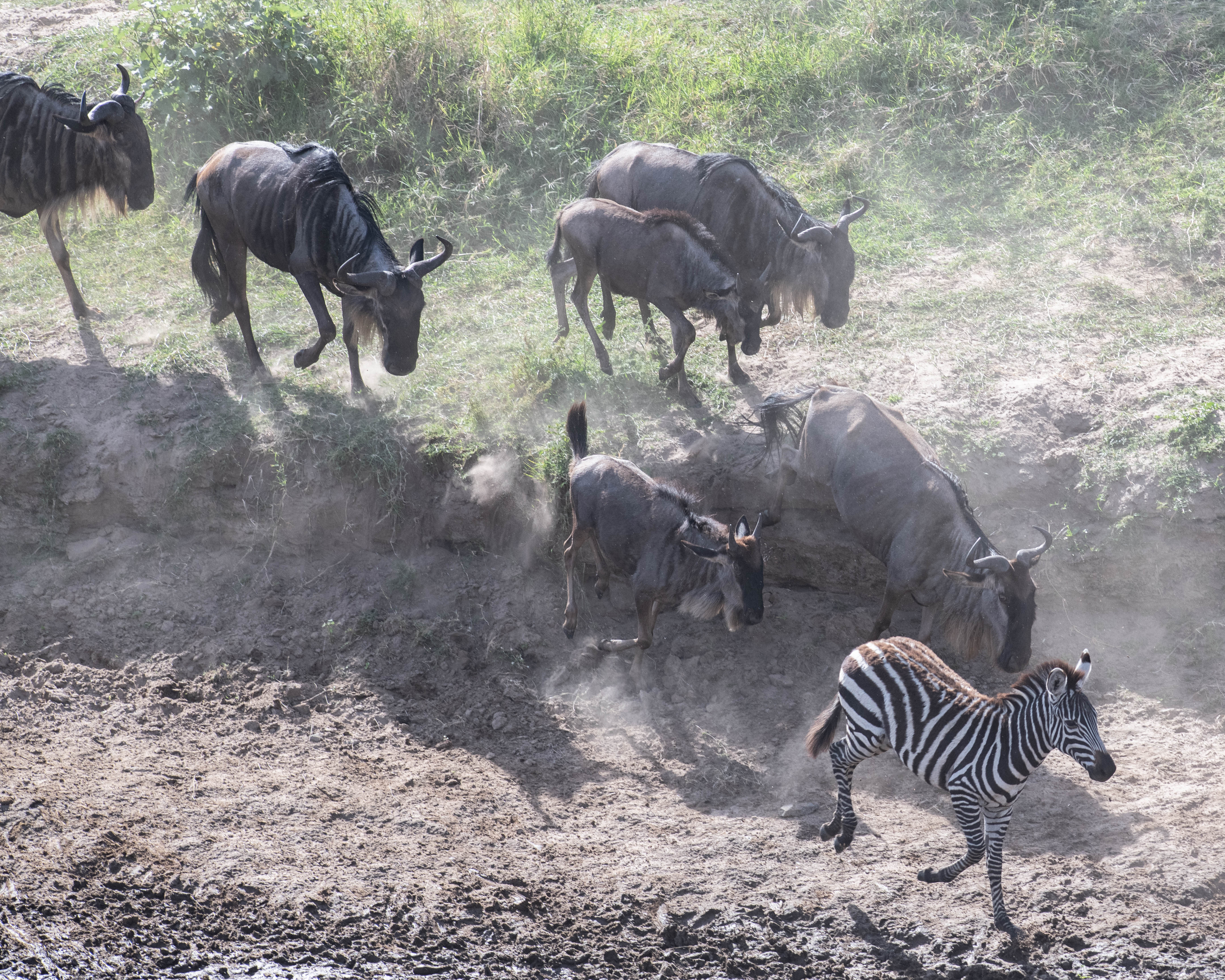 This was the day that we saw what we came for – The Great Migration! We started the day with a beautiful sunrise at our camp before we left. Before we got to the river crossing, we saw one of our leopard friends from the day before. When we pulled up to the river, it was probably only about 10 minutes and then the one wildebeest made a decision and it was on! It was almost like someone turned on a faucet – the wildebeest and zebra poured down the bank to the water in giant clouds of dust. Some stopped for a drink while others continued up the opposite bank and into fresh grasses waiting to be grazed. There were no crocodiles or hippos in this portion of the river, so it was a peaceful crossing for the herd. Our jeep was positioned right where the herd came up the river bank after the crossing, so we had a perfect view of the crossing aftermath. Most made it unscathed, but we did see a few limping after they finished crossing. Mike took this amazing timelapse video of the crossing from our vantage point: