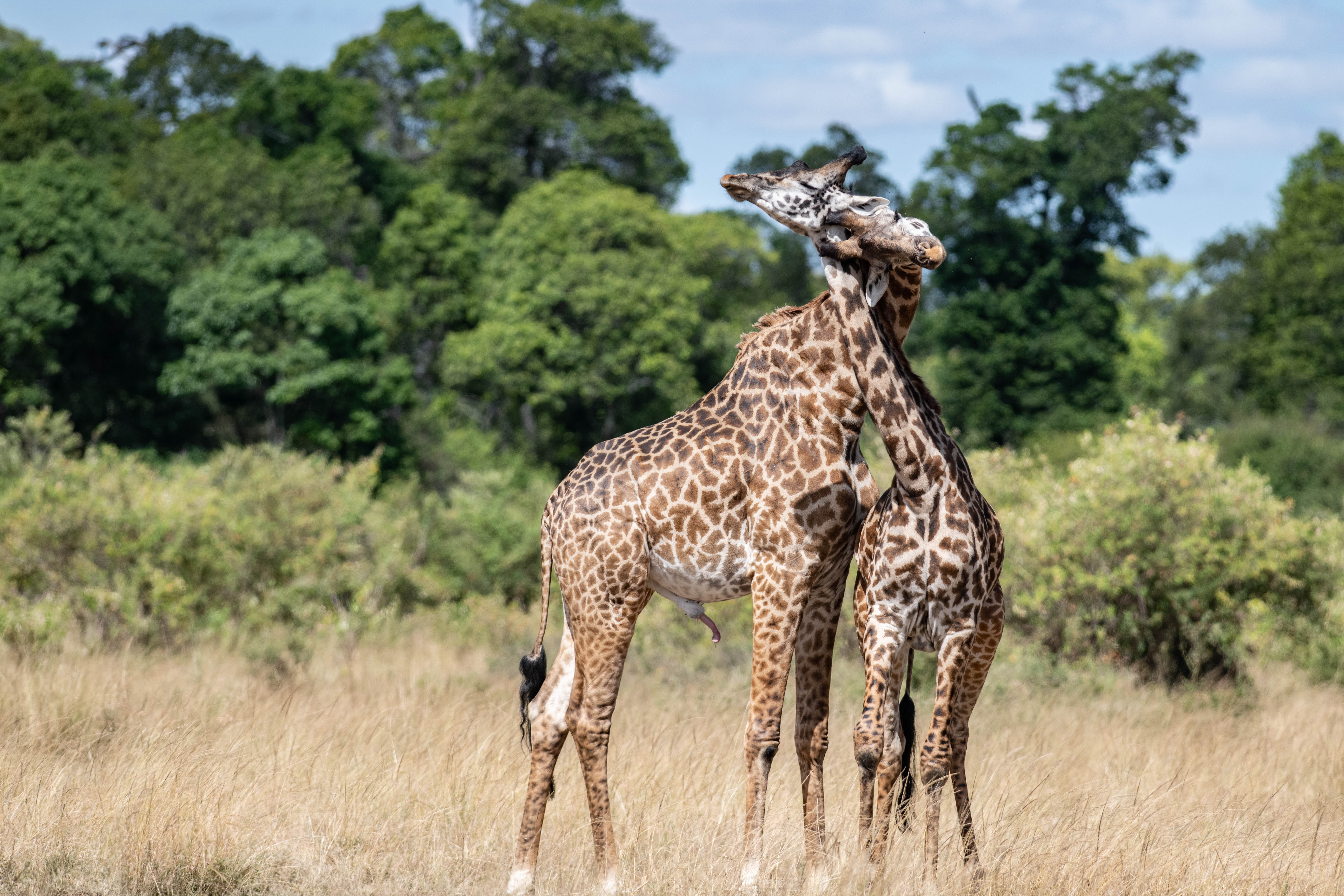 The last eventful animal sighting we had was two giraffes necking. We saw two giraffes close to each other and stopped to watch. The giraffes started circling one another and rubbing their necks together. It was mesmerizing to watch, like this intricate rehearsed dance. At one point, one mounted the other, so I thought we were actually seeing the giraffe mating ritual. However, the two giraffes were both male! What looked to us like a romantic dalliance was actually an assertion of dominance. It was really interesting!