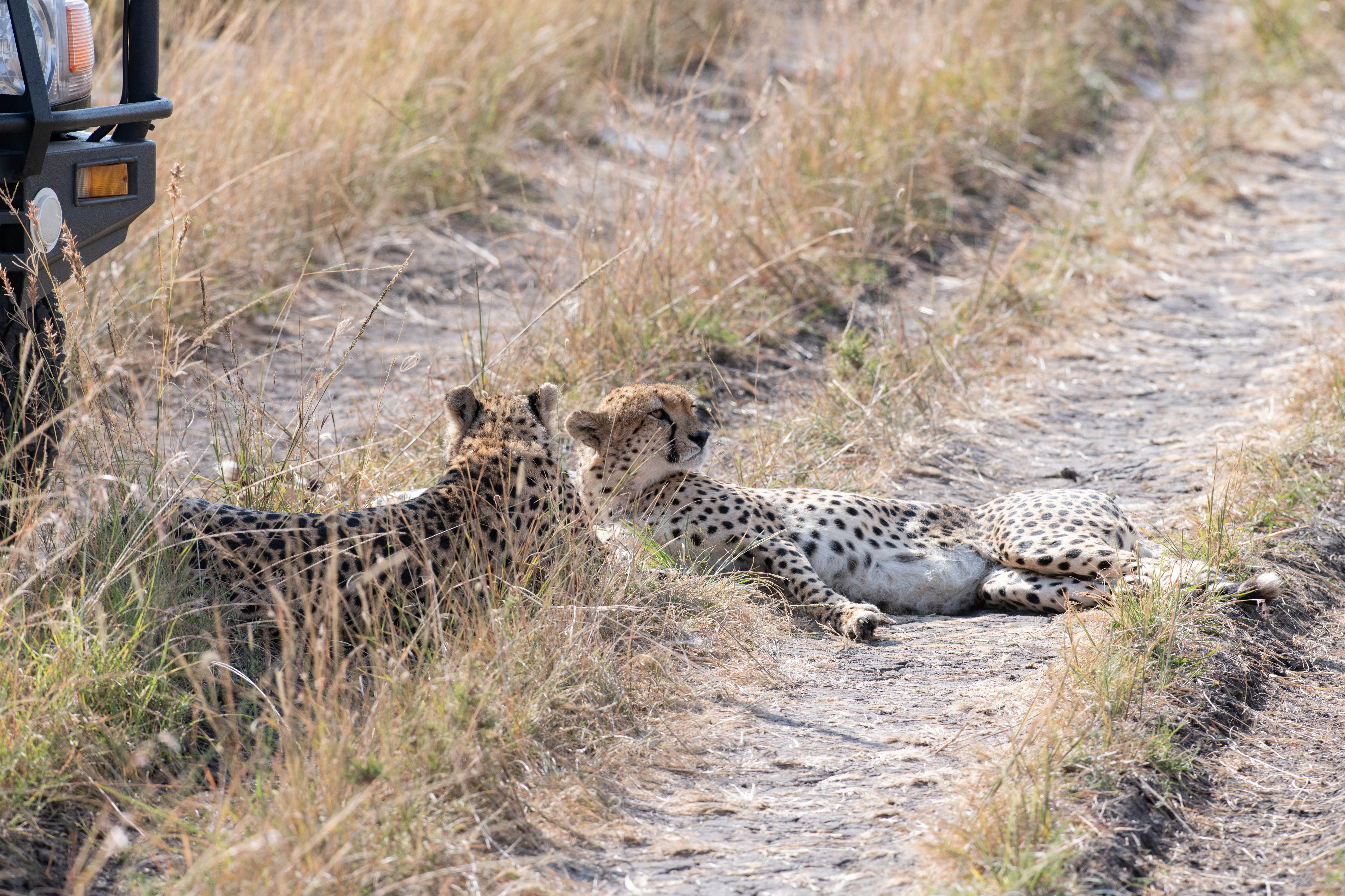 We missed the chase and takedown, but arrived to see that the cheetahs caught a zebra. The jeeps circled around and provided some much needed cover for the cheetahs to finish the job and begin their feast. I’m not going to lie – it was brutal to witness. It was not quick and I had to plug my ears so I didn’t have to listen to the sounds that the zebra was making. I couldn’t watch either, so I just sat in my seat in the jeep with my eyes closed and my fingers in my ears and waited for Mike to let me know it was over. Once it was over, the two cheetahs who were the most out of breath went over to the shade that the jeeps provided to catch their breath. The other cheetah started in on eating. It was interesting to see how alert the cheetahs were while they were resting and eating. Since they are a smaller cat, they don’t want to have to fight off anyone else for their meal, so if something else (a lion or a hyena) shows up, they leave. So they try and eat as quickly as they can so they can at least get their belly full before they have to leave. Being in a group of three helps a little bit because there are more eyes on the lookout, but even in a group of three they aren’t looking to get into a fight. Once the other two caught their breath, they joined in the feast. We watched for a little bit longer, but then the rangers came in and all the jeeps scattered. Overall, it was a tough day, but one where we experienced nature at work.